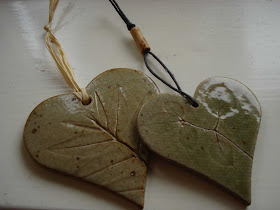 I serduszka ceramiczne z wytloczonymi wzorkami lisci (z pracowni ceramicznej Nanny Taksoe-Jensen w moim ulubionym mlynie) - niby nic wielkiego, ale jak ladnie, jesiennie teraz wygladaja na scianie w pokoju:).