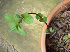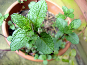 Potted chocolate mint somehow survived the cold months.